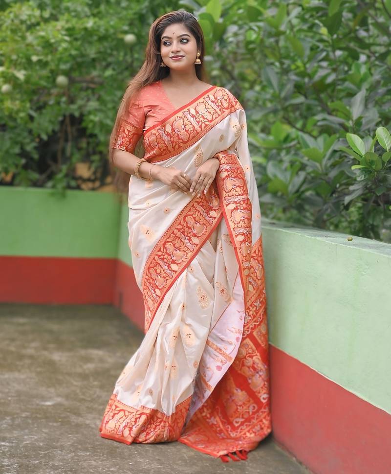 • Saree : Color- White / Fabric- Silk Blend • Blouse : Color- Red / Fabric- Silk Saree Details