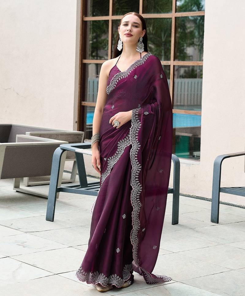Wine Embroidered Embellished Shimmer Chiffon Bollywood Saree With Blouse