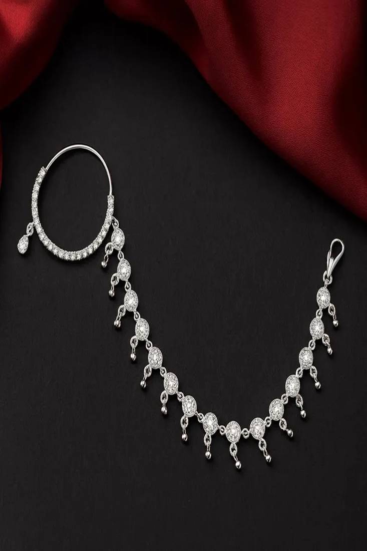 Cz Diamond Bridal Nath: Silver Indian Nose Ring With Chain