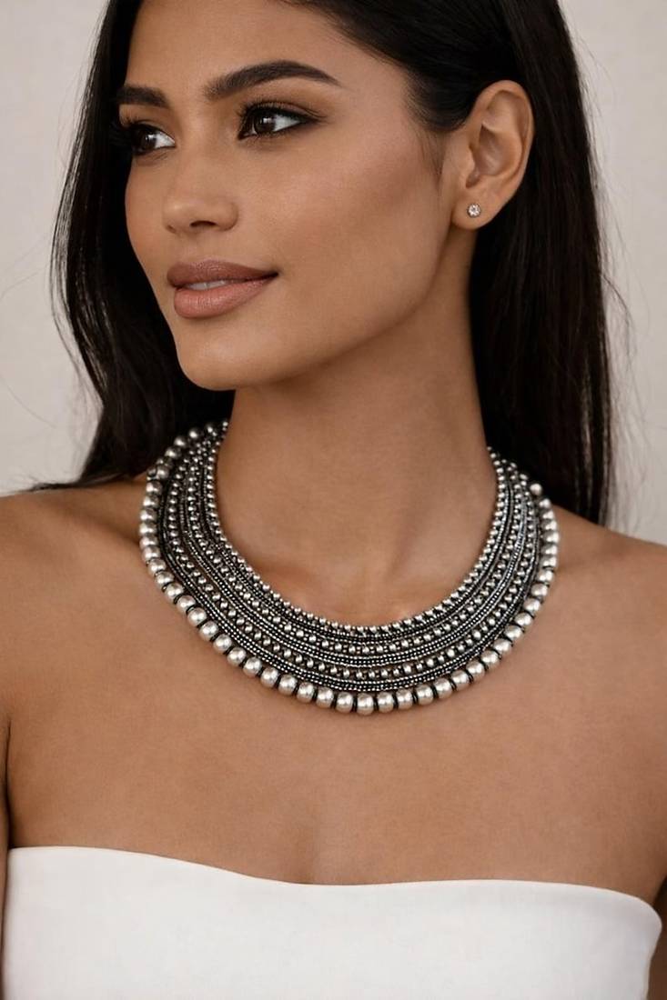 Oxidised Silver Layered Bead Necklace|Tribal Boho Statement Choker