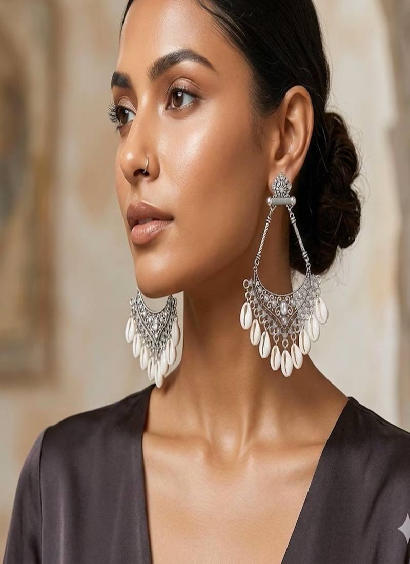 This is a beautiful Cowrie long Shell tribal Earrings Afghani oxidised indian jewellery, office casual wear earrings and earring set that will elevate your look. This is inspired by tribal and traditional looks. This Indian jewelry is of white colour which makes it easy to pair with any kind of outfit in your closetSpecifications [-]
