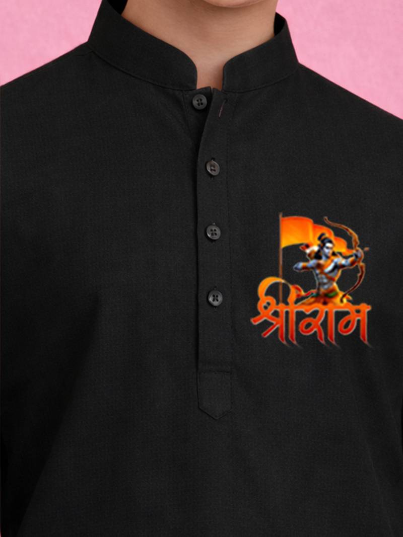 JBN presents this bold black pure cotton kurta pyjama set featuring an exclusive Ram Navami special sticker placement print on the chest. The kurta showcases a mandarin collar, button closure, knee-length straight cut with side slits, and full sleeves for a refined devotional ethnic look. Paired with a comfortable white cotton blend pyjama with elasticated waist and inseam pocket. Perfect for Ram Navami, Hanuman Jayanti, religious gatherings, and traditional festive occasions across all regions of India.