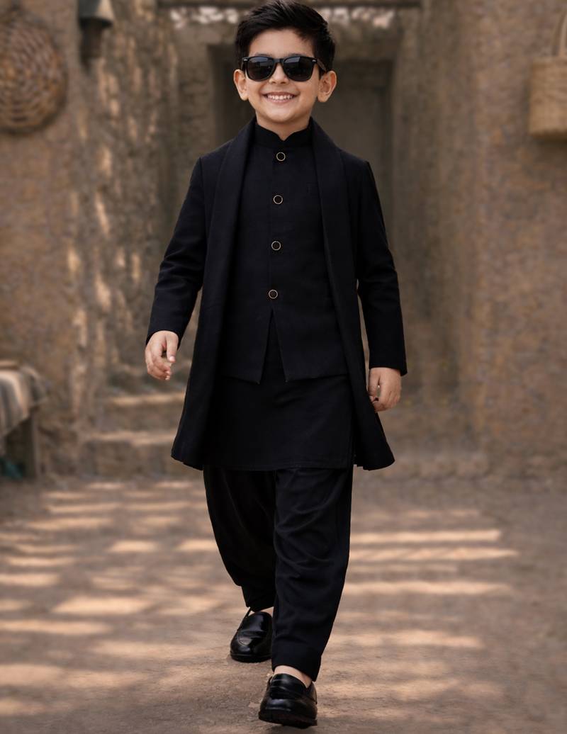 If you find the product for less we'll match it! Know Morepresents this festive boys' black solid 4-piece set in premium imported suiting fabric. the set includes a classic jodhpuri jacket with 1 pocket, a straight-cut knee-length kurta with mandarin collar, button closure, full sleeves, side slits, and 2 pockets, a plain black patiala with elasticated waist, and a coordinating dupatta. an iconic ethnic ensemble perfect for eid, festive, and traditional celebrations across all regions.