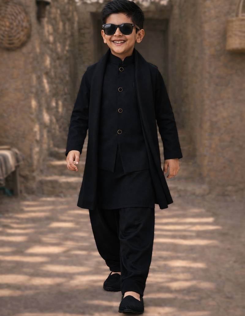 If you find the product for less we'll match it! Know Morepresents this festive boys' black solid 4-piece set in premium imported suiting fabric. the set includes an embellished nehru jacket with 1 pocket, a straight-cut knee-length kurta with mandarin collar, button closure, full sleeves, side slits, and 2 pockets, a plain black patiala with elasticated waist, and a matching dupatta. a complete ethnic ensemble perfect for eid, festive, and traditional celebrations across all regions.