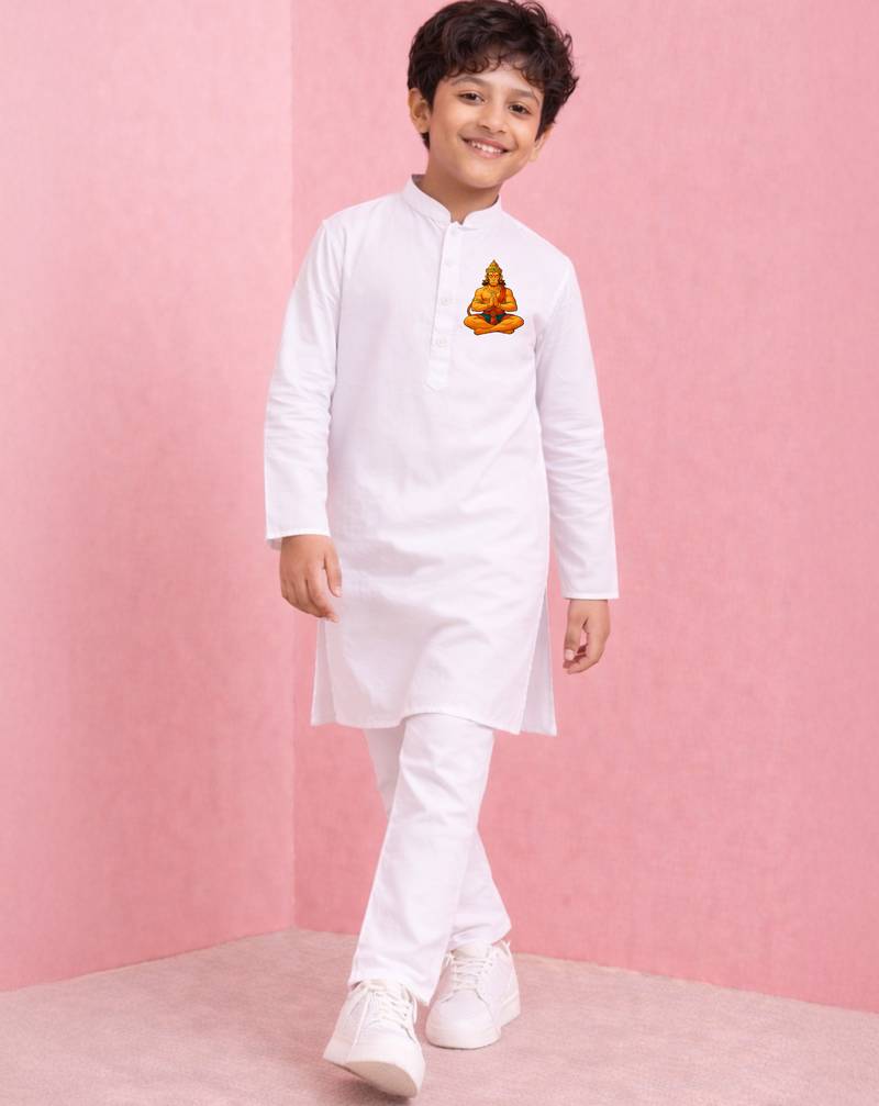 Boys White Cotton Kurta Pyjama Set With Hanuman Sticker Print