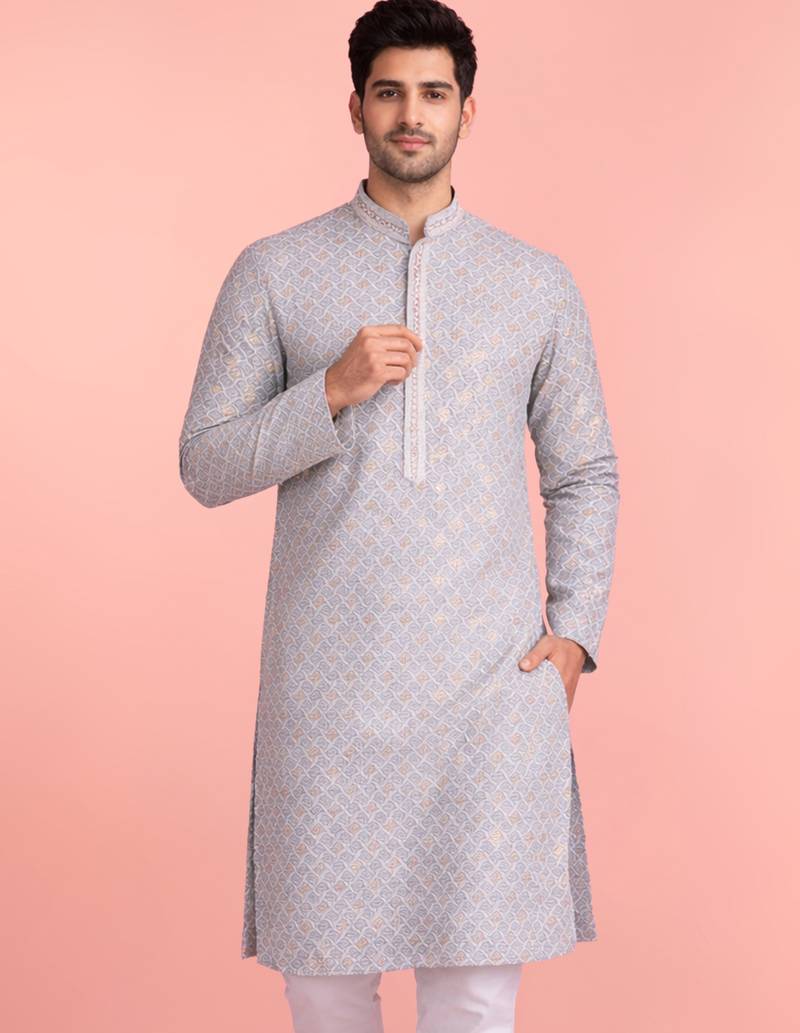 this aqua rayon kurta for men is detailed with all-over sequin embroidery in geometric patterns, offering a vibrant and refined festive appearance. it features a straight knee-length cut, mandarin collar, full sleeves, and side slits to ensure comfort and freedom of movement. made from premium rayon, the kurta provides smooth texture and breathable wear during weddings and long festive events. functional inseam pockets add convenience. the bright aqua fabric with subtle sequin shine complements white or cream churidar, producing a balanced ethnic outfit. this kurta combines traditional embroidery, modern tailoring, and lightweight fabric suitable for festive and ceremonial occasions.