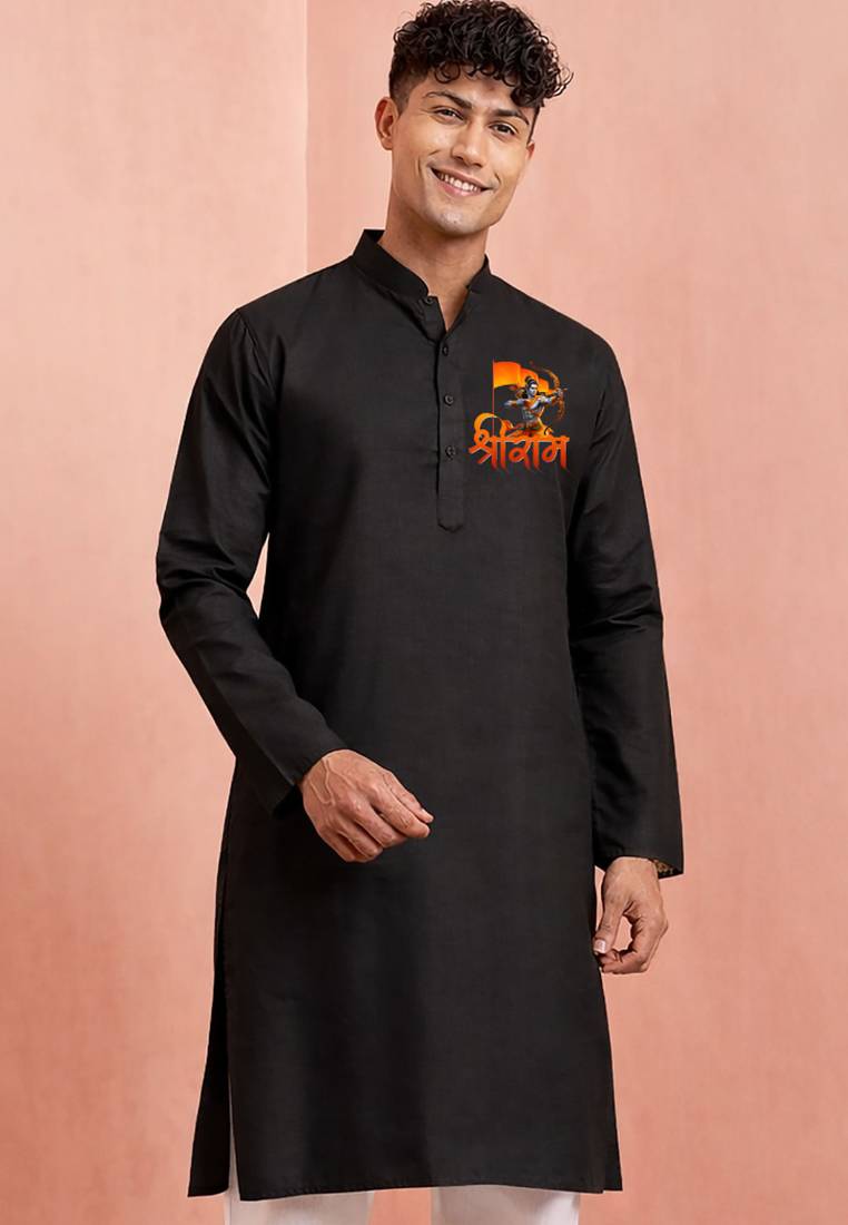 If you find the product for less we'll match it! Know Moremen's black pure cotton kurta from hanuman jayanti collection has ram special sticker chest print, chinese collar kameez, full sleeves, button closure, knee length straight, side slits, straight pyjama. plain cotton work, traditional look, black color. stitched by jbn creations. for ram navami, pujas, festive devotional wear in india. top black cotton fabric.