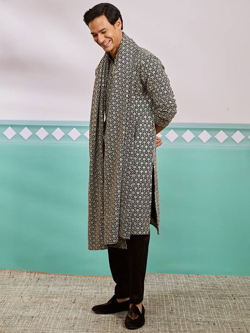 Black Chikankari Embroidered Kurta Set With Fine Satin Pyjama & Embroidered Dupatta | Eid Wedding Wear