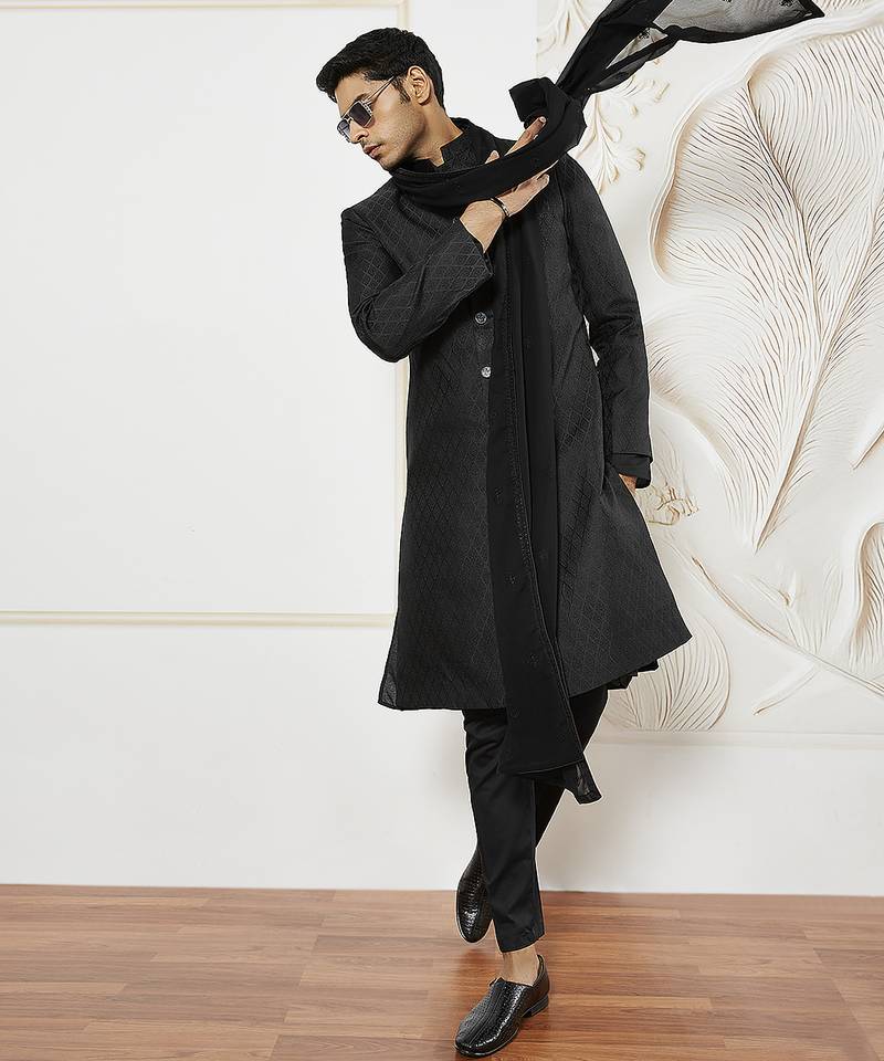Black Kalka Jacquard Sherwani Set With Kurta, Pyjama & Embroidered Georgette Dupatta | Wedding Festive Wear