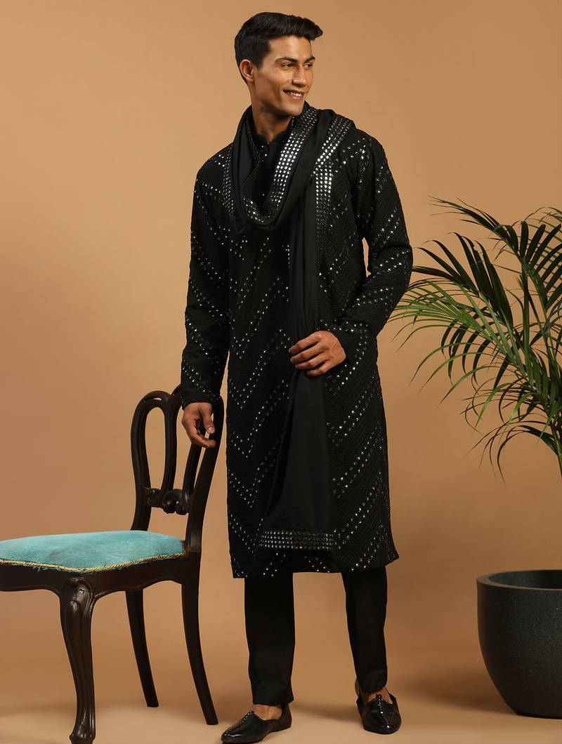 Embrace festive luxury with this premium 3-piece coordinated ethnic ensemble from Vastramay. The set showcases a black georgette long kurta featuring exquisite all-over mirror work in geometric zigzag 2-line pattern that creates captivating shimmer and movement. The kurta is tailored with mandarin collar, concealed closure for a clean sleek silhouette, knee-length full sleeve regular fit with side slits for comfort, crepe lining for structure, and 2 inseam pockets for functionality. Complementing the embellished kurta is a black fine satin pyjama featuring elasticated waistband with drawstring closure for adjustable comfort and 2 inseam pockets for convenience. Completing the ensemble is a black mirror work dupatta crafted in silk fabric, perfect for draping traditional elegance over the shoulder or around the neck. The all-over mirror work on lightweight georgette creates stunning visual impact and graceful movement while the fine satin pyjama adds luxurious tactile comfort. The coordinated mirror work dupatta enhances the ensemble with traditional sophistication. The all-black palette with mirror embellishment ensures regal presence at celebrations. Ideal for weddings, Durga Puja, Diwali, Navratri, EID, Onam, Independence Day, and festive occasions. This ensemble combines traditional mirror work artistry with contemporary georgette luxury. Care Instructions: Dry clean only for kurta and dupatta; gentle hand wash for satin pyjama.