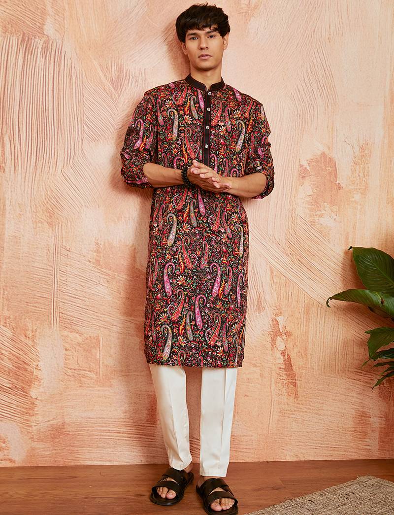 Black Paisley Print Viscose Blend Kurta With Cream Viscose Pyjama | Festive Ethnic Wear