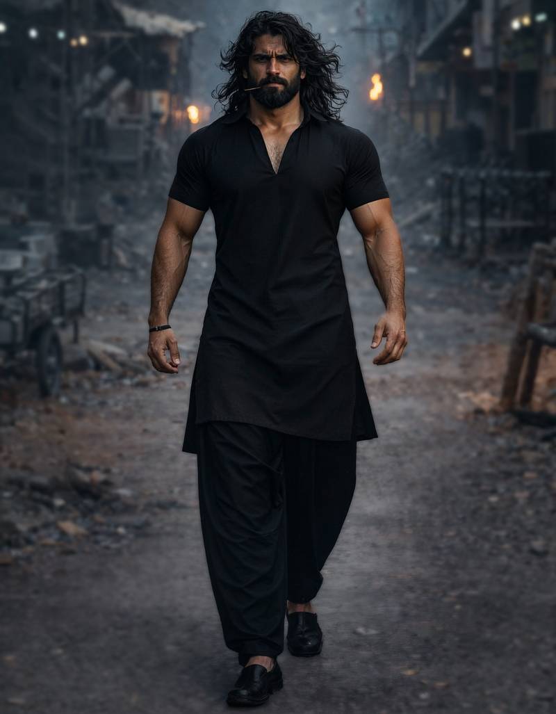 Redefine festive fashion with this edgy, contemporary President-style kurta set from Vastramay. The kurta is tailored in smooth cotton silk in a rich solid black, featuring a distinct shirt collar with V-neck, slip-on opening, round hemline, short sleeves, and a straight silhouette with side slits — a modern silhouette perfect for party nights and festive gatherings alike. The accompanying black gher wala patiala in a flowing silk blend, with a drawstring waistband and inseam pockets, amplifies the drama of the monochrome look with its generous flare. A bold, unified ensemble for Eid, festive parties, casual occasions, and summer celebrations. Care Instructions: Gentle machine wash recommended.