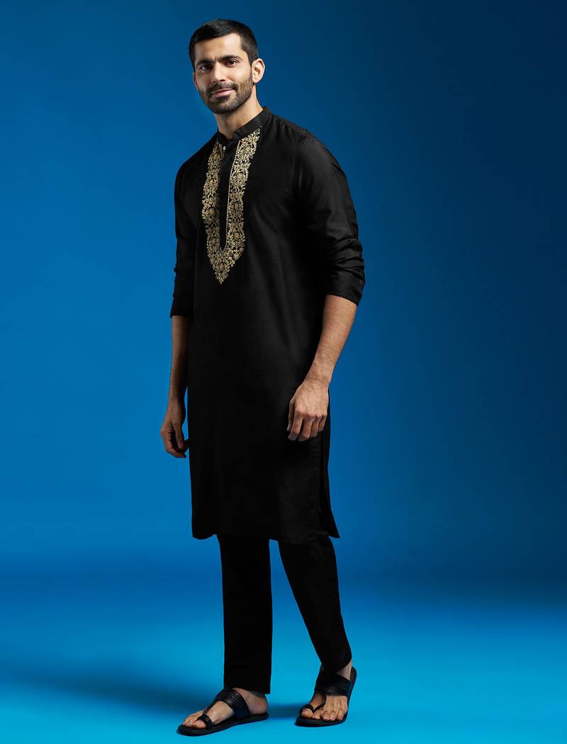 Black Viscose Hand Embroidered Floral Kurta With Satin Pyjama | Festive Wedding