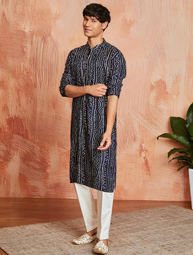 Add vibrant style to your wardrobe with this blue and cream kurta pyjama set from Vastramay. The dark blue rayon kurta showcases an all-over foil Bandhani digital print, blending traditional Bandhani patterns with contemporary foil accents for distinctive ethnic appeal. Designed with a mandarin collar, concealed button placket, and knee-length straight fit, the kurta includes full sleeves, side slits, and 2 inseam pockets for practicality. The cream viscose pyjama provides comfortable pairing with its elasticated drawstring waistband. Made from premium rayon that offers breathability and elegant drape, this set combines traditional print aesthetics with modern comfort. The foil detailing adds festive shimmer while the Bandhani pattern brings cultural richness. Perfect for casual wear, summer occasions, weddings, Diwali, Holi collection, Navratri, Janmashtami, Raksha Bandhan, and everyday festive moments. Versatile and easy to style, this set transitions seamlessly from daytime gatherings to evening celebrations. Care Instructions: Gentle hand wash or dry clean to preserve foil print and fabric quality.