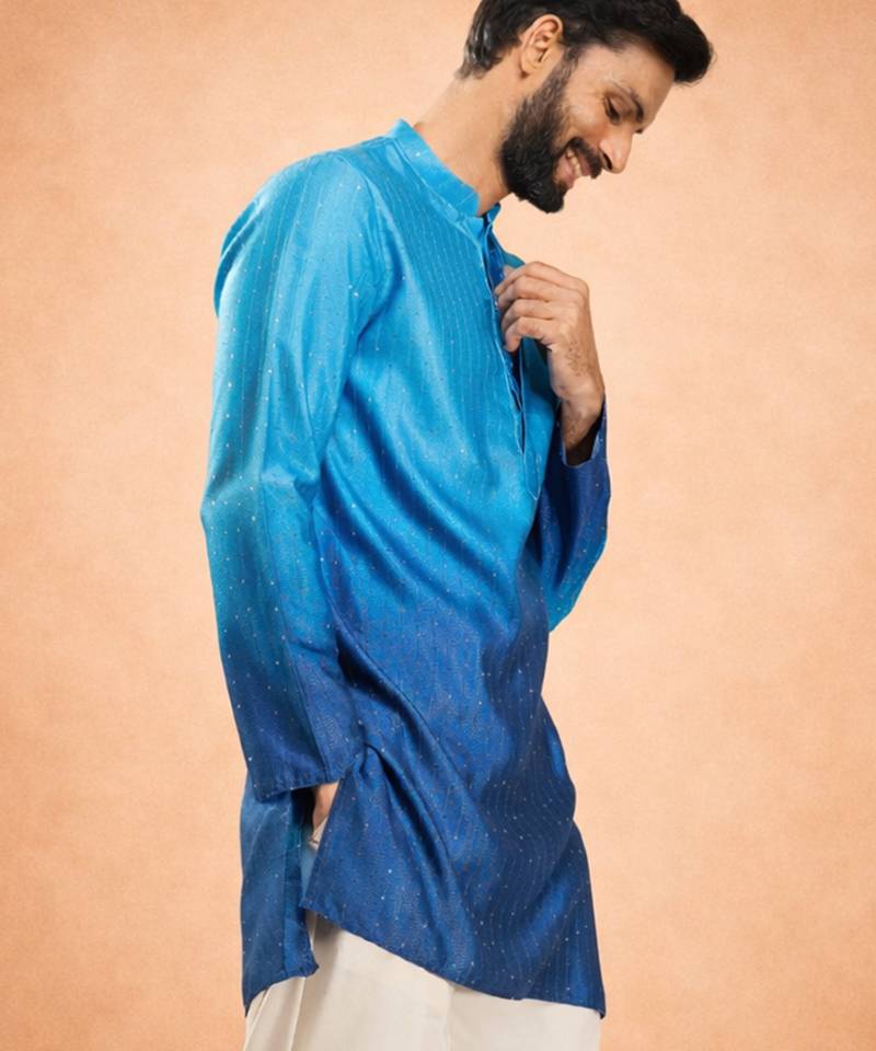 Shine at every occasion with the VASTRAMAY Men's Blue Silk Ombre Sequin Kurta — a striking mid-length kurta in bold blue, combining luxurious silk blend fabric, ombre digital print and all-over geometric sequin embroidery.