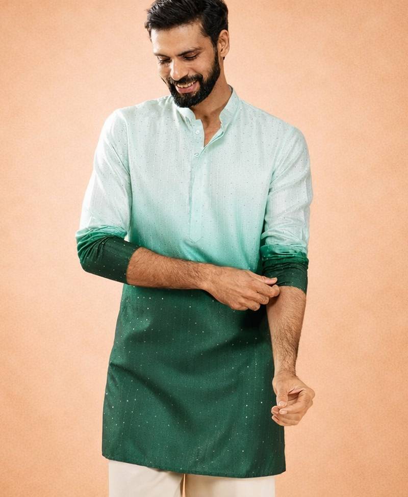 Make a dazzling entrance at every festive event with the VASTRAMAY Men's Bottle Green Silk Ombre Sequin Kurta — a premium mid-length kurta that seamlessly fuses luxurious silk blend fabric, ombre digital print and all-over geometric sequin embroidery.