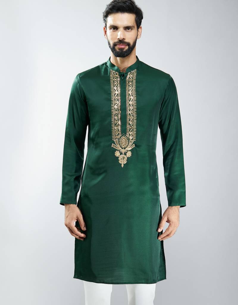 Men Bottle Green Silk Embroidered Kurta Wedding & Festive Wear