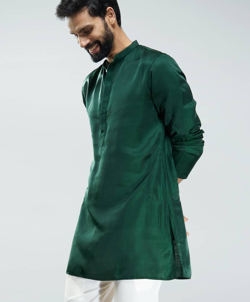 Men Bottle Green Silk Kurta Solid Mid Length Kurta For Wedding & Festive Wear