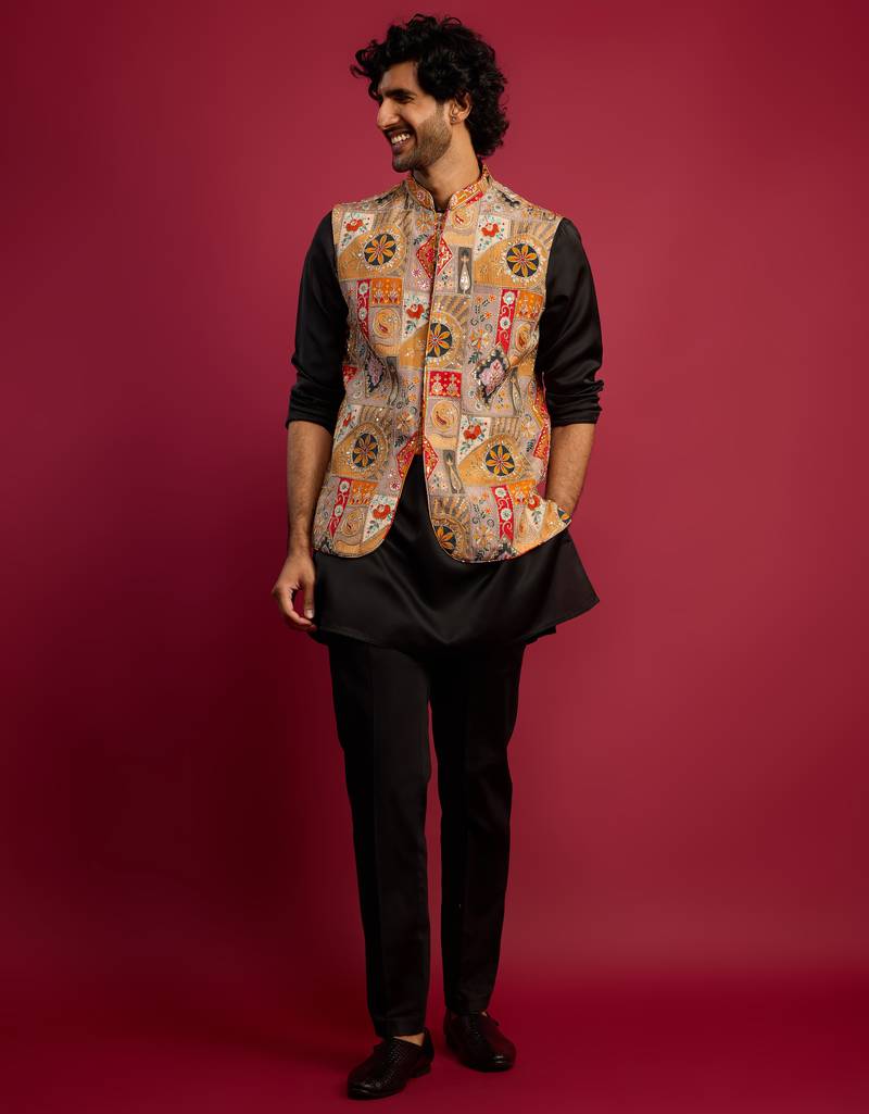 This elegant ethnic bundle from Vastramay brings together a chiku embroidered Nehru jacket with a classic black kurta and pant style pyjama. Crafted for festive and wedding wear, the combination offers a balanced blend of tradition, comfort, and contemporary appeal.