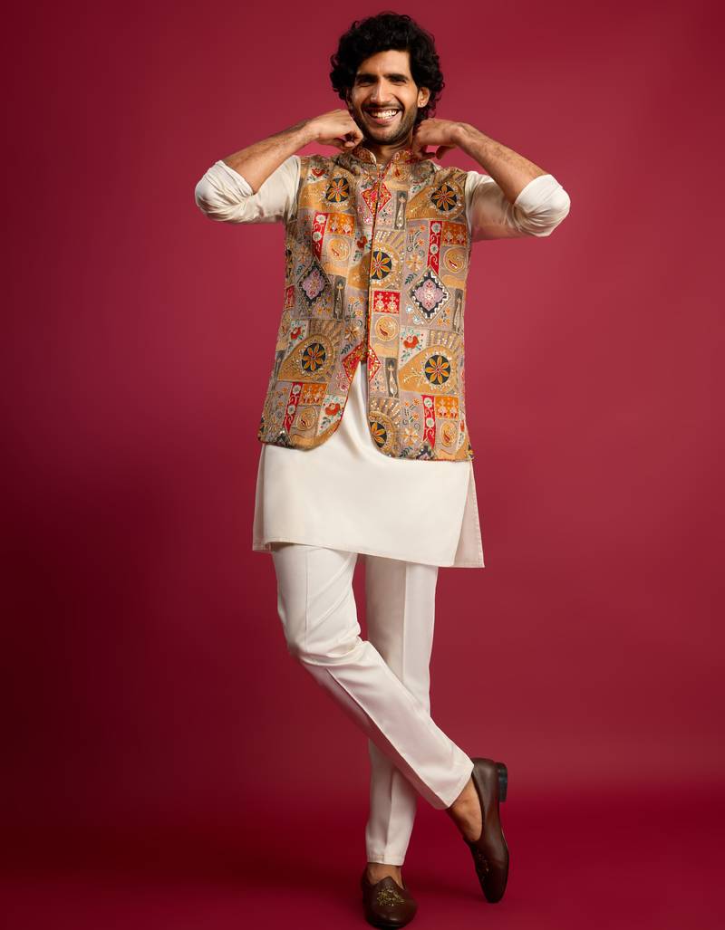 Designed for timeless ethnic styling, this Vastramay festive bundle includes a chiku embroidered chinon silk Nehru jacket layered over a solid cream cotton satin kurta, paired with a coordinating pant style pyjama. The soft neutral palette makes this set versatile for weddings, Diwali, festive gatherings, and formal ethnic occasions.