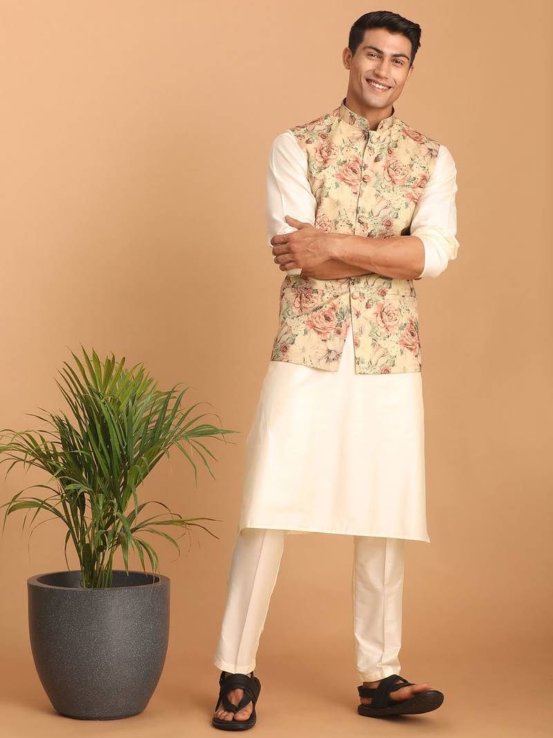 Chiku Floral Print Nehru Jacket With Cream Kurta Pyjama Set | 3 Piece Silk Festive Ethnic Wear