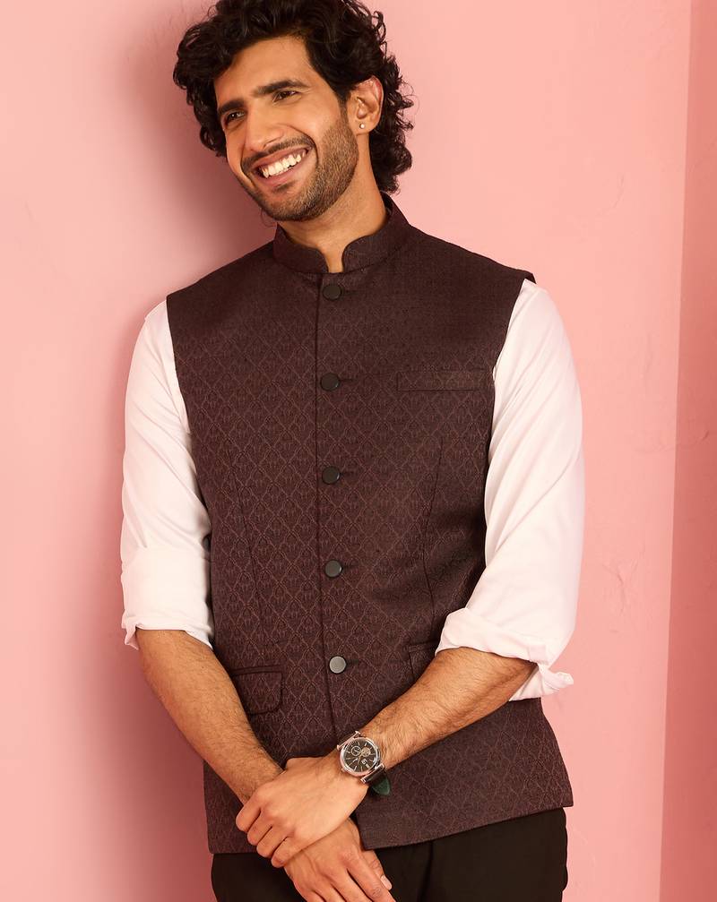 Add refined elegance to your ethnic and formal collection with this chocolate brown Nehru jacket from Vastramay. The jacket features the exclusive Black Panther floral-type design woven in jacquard technique across premium imported suiting fabric. All-over floral jacquard pattern creates rich texture and visual depth in sophisticated brown tones. Classic mandarin collar with button closure offers traditional appeal, while straight-fit construction with back slit provides ease of movement. Thoughtfully designed with 1 chest pocket and 2 welt pockets featuring flap closures for practical storage needs. Interior satin lining ensures smooth drape and comfortable wear throughout extended occasions. Waist-length sleeveless design allows versatile layering options. Suitable for weddings, Diwali festivities, festive events, formal parties, and special celebrations. Care Instructions: Dry clean only to maintain jacquard weave and fabric quality.