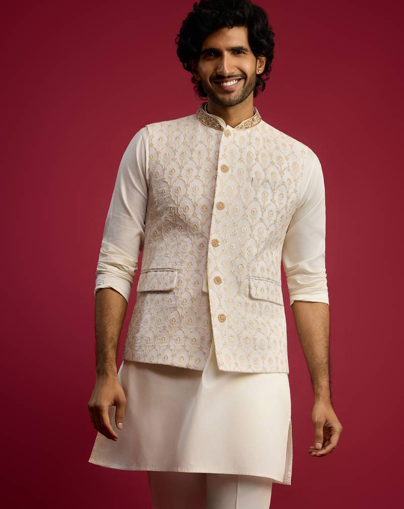 Cream Embroidered Georgette Nehru Jacket | Wedding Festive Wear