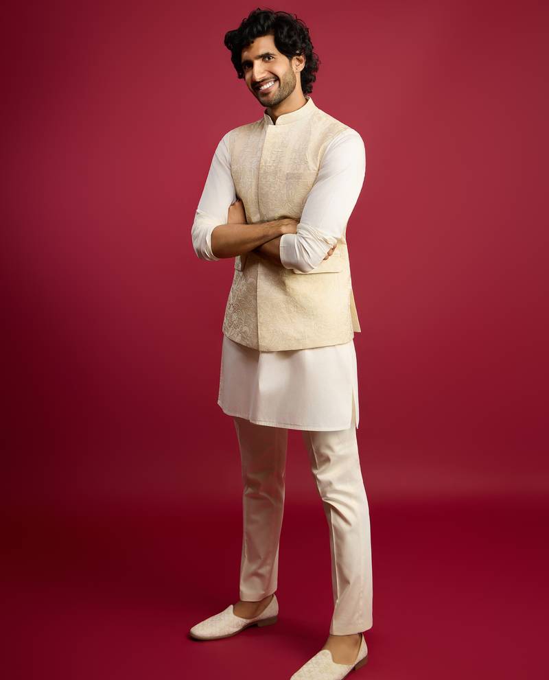 Transform your festive wardrobe with this premium 3-piece ethnic ensemble from Vastramay. The centerpiece is a cream silk blend slub-type Nehru jacket featuring exquisite thread embroidery in floral all-over pattern, tailored with mandarin collar, concealed placket, waist-length sleeveless silhouette, back slit, 1 chest pocket, 2 flap pockets, inseam pocket, and satin lining for elegant finish. The intricate floral embroidery adds sophisticated festive appeal. Layered with a cream fine satin mid-length kurta designed with thin concealed placket with square detailing, mandarin collar with button and concealed placket, thigh length, full sleeves, side slits, and inseam pocket for refined elegance. Paired with a cream cotton lycra pant-style pyjama featuring button and zip closure and inseam pocket for modern comfort. The all-cream palette offers sophisticated monochrome elegance with versatile styling options. Perfect for weddings, Diwali, Navratri, Durga Puja, parties, formal occasions, and summer celebrations across all regions. This all-season set combines delicate floral embroidery with contemporary formal design. Care Instructions: Dry clean recommended for jacket; gentle wash for kurta and pant.