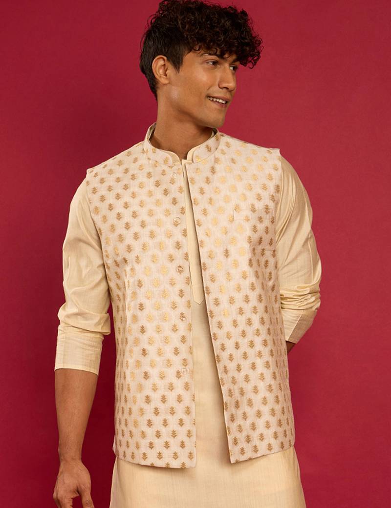 Elevate your festive styling with this cream silk blend Nehru jacket from Vastramay. The jacket is crafted in premium Kota silk blend fabric featuring exquisite Jaari Buti zari weave work throughout. All-over jacquard pattern with ethnic motifs in zari creates rich, textured surface that catches light beautifully, adding festive elegance and traditional opulence. Cream base provides sophisticated backdrop for the intricate zari work, making it versatile for pairing with various kurta colors. Mandarin collar with button closure maintains classic ethnic appeal while concealed placket ensures clean, refined lines perfect for formal occasions. Waist-length straight-fit sleeveless design makes it ideal layering piece over traditional and contemporary outfits. Thoughtfully designed with 1 chest pocket and welt pocket offering practical storage without compromising aesthetics. The combination of premium Kota silk blend and traditional zari weave creates statement piece suitable for significant festivities and celebrations across all regions. Ideal for weddings, Diwali festivities, festive gatherings, Navratri celebrations, parties, and traditional events. Care Instructions: Dry clean only to preserve zari work and silk blend fabric.