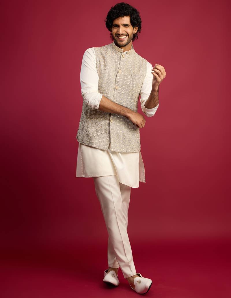Grey Chikankari Nehru Jacket With Cream Satin Kurta Pant Set | Wedding & Festive Wear