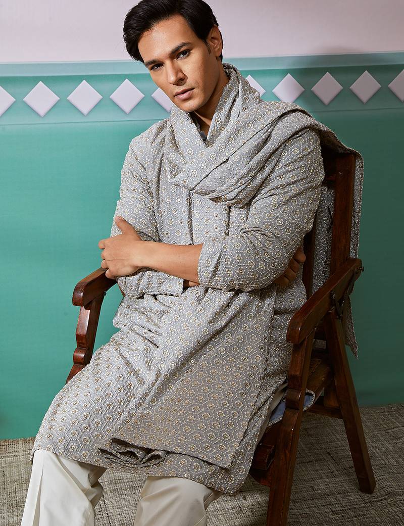 Grey Chikankari Rayon Kurta With Cream Pyjama & Grey Embroidered Dupatta | Complete Festive Set