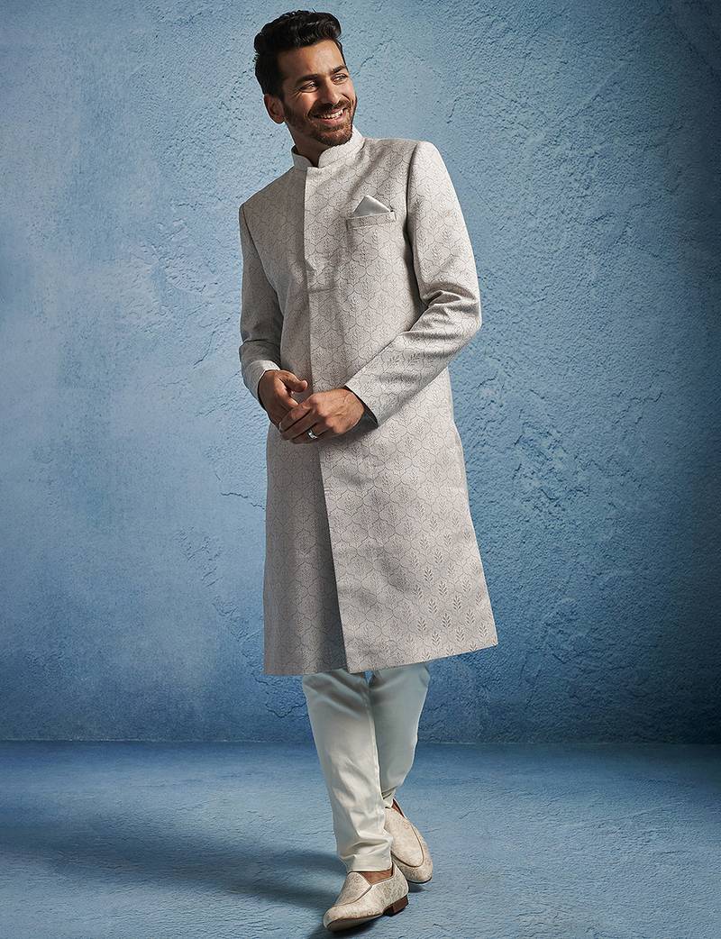 Grey Kenzo Jacquard Silk Blend Sherwani With Cream Fine Satin Pyjama | Premium Wedding Set