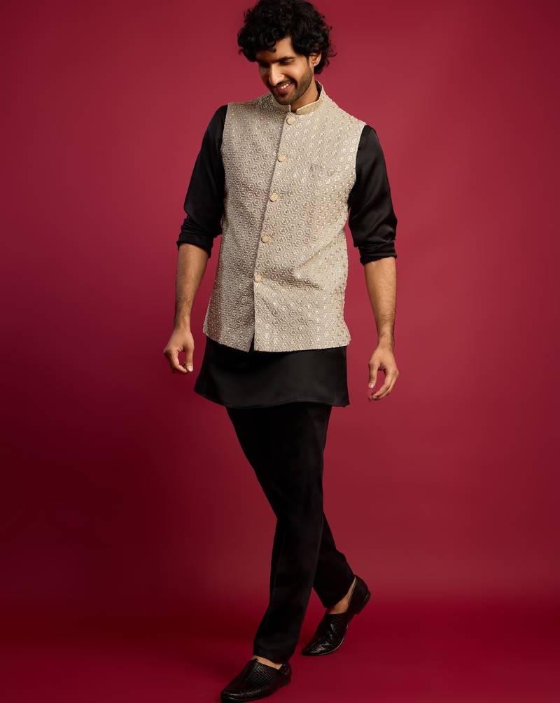 Grey Sequin & Thread Embroidered Nehru Jacket With Black Satin Kurta & Pants Set | Festive Ethnic Bundle |