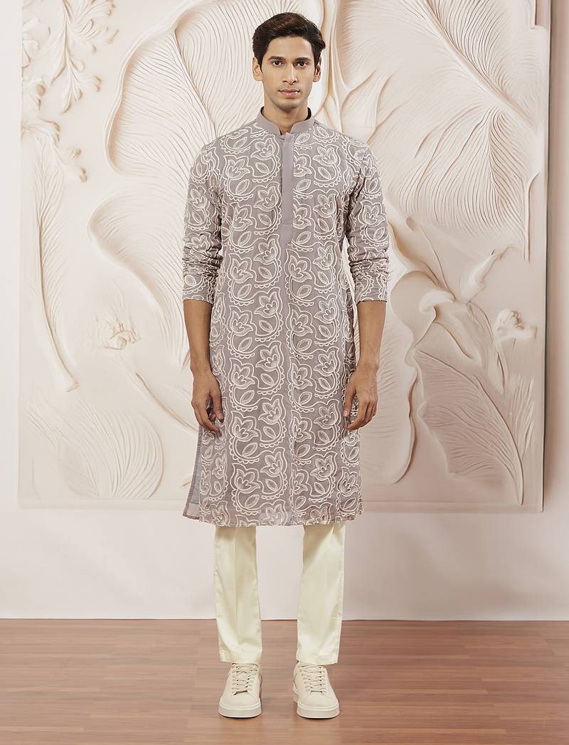 Refresh your festive wardrobe with this exquisite ethnic bundle from Vastramay. The set includes a beautifully crafted lavender Fox Georgette kurta featuring all-over chord embroidery in delicate floral motifs covering the entire fabric. The knee-length kurta is tailored in a straight silhouette with full sleeves, concealed button closure, and side slits, lined with crepe for added comfort. Paired with a cream fine satin pyjama that offers supreme comfort with its elasticated drawstring waistband and 2 inseam pockets for practicality. The elaborate floral chord embroidery combined with the soft lavender hue creates a sophisticated and contemporary festive ensemble. Ideal for weddings, Diwali, festive glitz celebrations, and party events, this kurta pyjama set perfectly blends modern aesthetics with traditional embroidery craftsmanship. Care Instructions: Dry clean recommended to preserve the chord embroidery and georgette fabric.