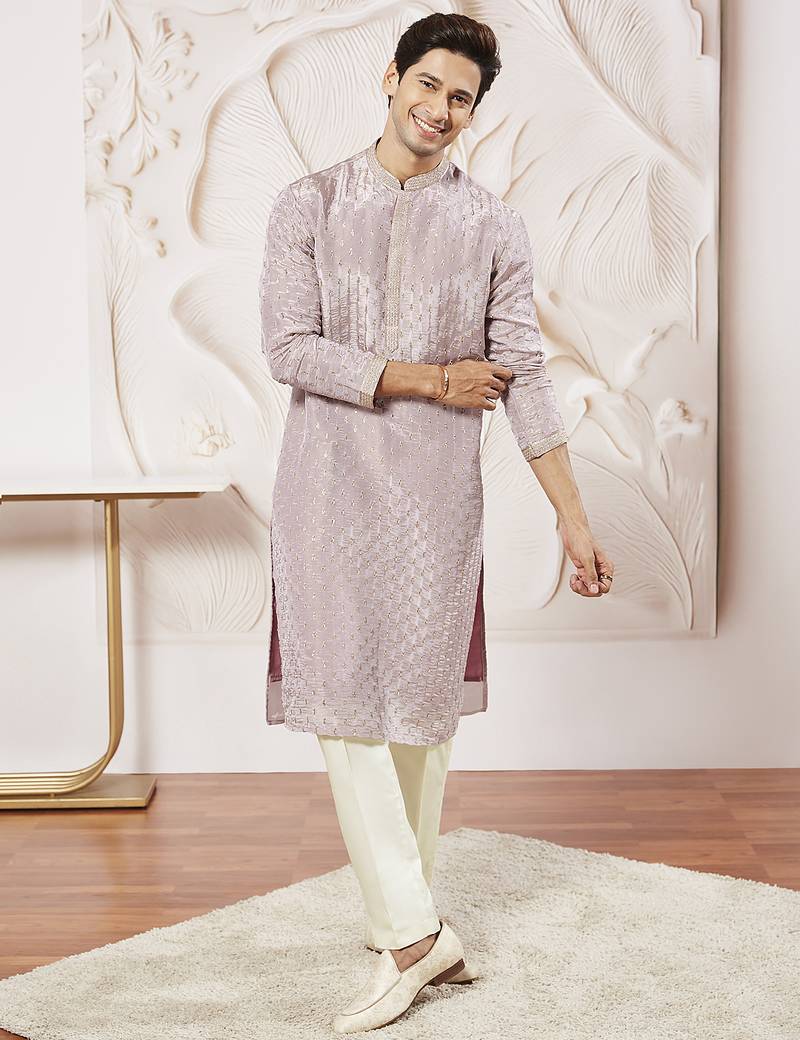 Celebrate with romantic elegance in this premium 2-piece tissue silk ethnic ensemble from Vastramay. The set showcases a lavender tissue silk long kurta featuring exquisite all-over zari embroidery and sequin work in ethnic motif pattern that creates luminous shimmer and sophisticated visual appeal. The kurta is tailored with mandarin collar, button closure with concealed placket for a refined sophisticated appearance, knee-length full sleeve straight fit with side slits for comfort, cotton lining for breathable wear, and 2 inseam pockets for functionality. Complementing the embellished kurta is a cream fine satin pyjama featuring elasticated waistband with drawstring closure for adjustable comfort and 2 inseam pockets for convenience. The all-over zari embroidery combined with sequin embellishment creates sophisticated glamour and festive elegance while the tissue silk fabric adds distinctive luminous sheen and lightweight luxury. The fine satin pyjama adds luxurious tactile comfort perfect for all-day celebrations. The lavender-cream color contrast delivers contemporary ethnic styling with romantic sophistication and unique appeal. The concealed placket creates a clean, elegant front that enhances the premium aesthetic. Ideal for weddings, Diwali, Navratri, Durga Puja, EID, Independence Day, Onam, parties, and festive occasions. This ensemble combines traditional zari embroidery craftsmanship with contemporary tissue silk luxury and romantic color palette. Care Instructions: Dry clean only for kurta; gentle hand wash for satin pyjama.