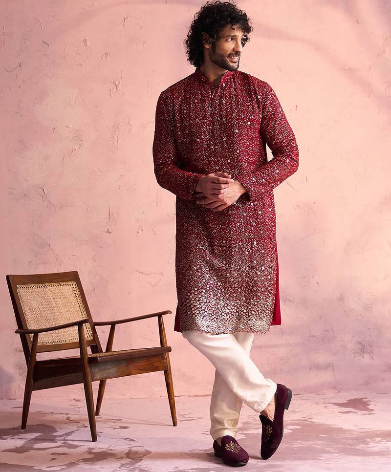 Elevate your festive presence with this luxurious ethnic bundle from Vastramay, crafted for discerning men who appreciate fine details. The set includes a regal maroon georgette kurta adorned with intricate sitara sequin work in a captivating all-over ombre pattern that transitions seamlessly across the garment. The daman embroidery provides additional ornate detailing at the kurta hem for enhanced visual appeal. Made from premium synthetic georgette fabric, the kurta features a mandarin collar and concealed button placket for a refined, modern finish. The straight-fit design includes side slits for ease of movement, knee-length cut with full sleeves, and comfortable crepe lining for all-day wearability. Two inseam pockets offer practical storage. Paired with cream fine satin pyjama crafted from premium silk fabric that provides a smooth, luxurious feel and elegant drape. The pyjama features an elasticated waistband with drawstring closure for adjustable comfort and includes 2 inseam pockets for functionality. This coordinated kurta pyjama set is perfect for weddings, Diwali, parties, and festive gatherings where sophistication meets glamour. The maroon and cream pairing with shimmering ombre sequins creates a rich, festive statement that commands attention. Care Instructions: Dry clean only to maintain sequin embellishment and fabric integrity.