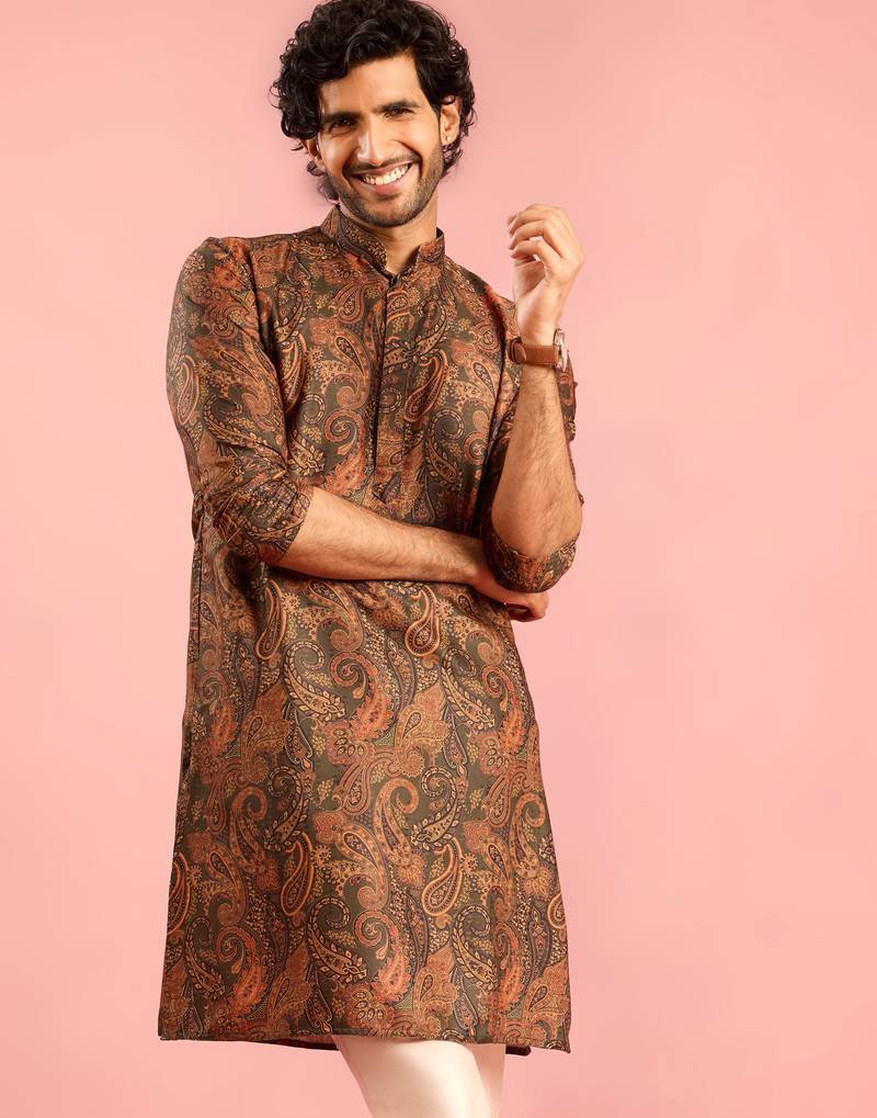 Mehendi Green Cotton Blend Kurta | All Over Paisley Digital Print Design