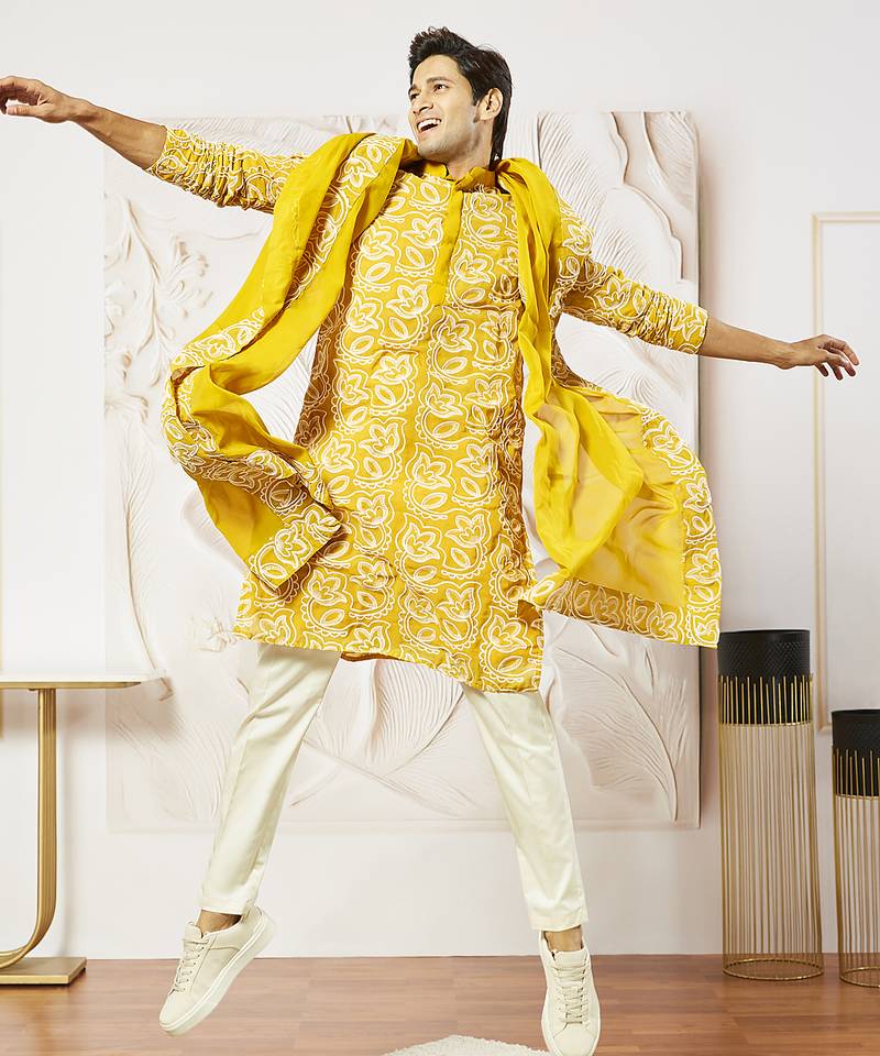 Celebrate with vibrant elegance in this premium 3-piece embroidered ethnic ensemble from Vastramay. The set showcases a striking mustard georgette long kurta featuring exquisite all-over floral chord embroidery that creates stunning visual richness and textural appeal. The kurta is tailored with mandarin collar, concealed closure for a clean sophisticated silhouette, knee-length full sleeve straight fit with side slits for comfort, crepe lining for structure, and 2 inseam pockets for functionality. Complementing the embroidered kurta is a cream fine satin pyjama featuring elasticated waistband with drawstring closure for adjustable comfort and 2 inseam pockets for convenience. Completing the ensemble is a matching mustard Fox georgette dupatta featuring coordinating floral embroidery, perfect for draping traditional elegance and enhancing the vibrant aesthetic. The all-over floral embroidery on lightweight georgette creates graceful movement and sophisticated appeal while the fine satin pyjama adds luxurious tactile comfort. The mustard-cream color contrast delivers bold contemporary ethnic styling with warm festive charm. Ideal for weddings, Diwali, Navratri, Durga Puja, EID, Independence Day, Onam, parties, and festive occasions. This ensemble combines traditional embroidery craftsmanship with modern georgette luxury. Care Instructions: Dry clean only for kurta and dupatta; gentle hand wash for satin pyjama.