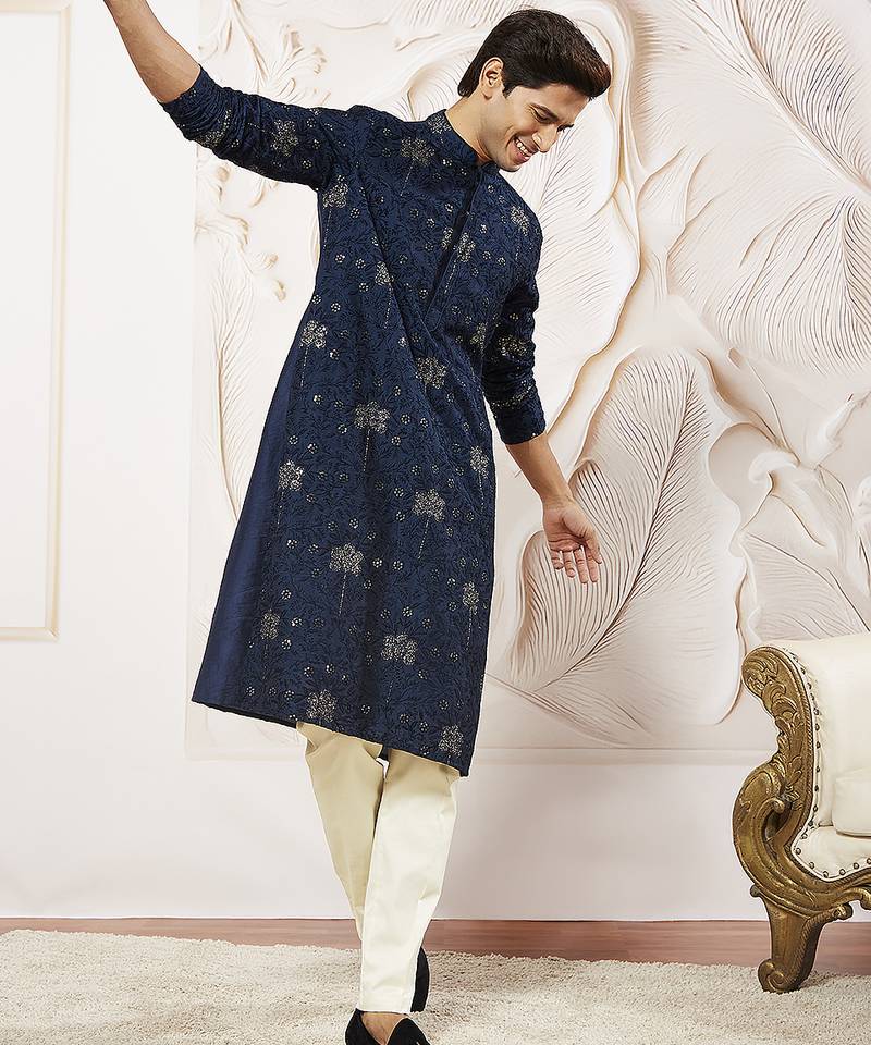 Captivate at every celebration with this premium 2-piece embroidered ethnic ensemble from Vastramay. The set showcases a navy blue silk blend long kurta featuring exquisite all-over sequin and resham floral embroidery that creates stunning visual richness and captivating shimmer. The kurta is tailored with mandarin collar, concealed closure for a clean sophisticated silhouette, knee-length full sleeve straight fit with side slits for comfort, crepe lining for structure and shape, and two inseam pockets for functionality. Complementing the embellished kurta is a cream fine satin pyjama featuring elasticated waistband with drawstring closure for adjustable comfort and 2 inseam pockets for convenience. The all-over floral embroidery combined with sequin embellishment creates sophisticated glamour and festive elegance while the fine satin pyjama adds luxurious tactile comfort. The navy blue-cream color contrast delivers contemporary ethnic styling with timeless versatility perfect for grand celebrations. The concealed closure ensures a sleek, modern appearance that stands out. Ideal for weddings, Diwali, Navratri, Durga Puja, EID, Independence Day, Onam, parties, and festive occasions. This ensemble combines traditional embroidery craftsmanship with contemporary silk luxury and sequin glamour. Care Instructions: Dry clean only for kurta; gentle hand wash for satin pyjama.