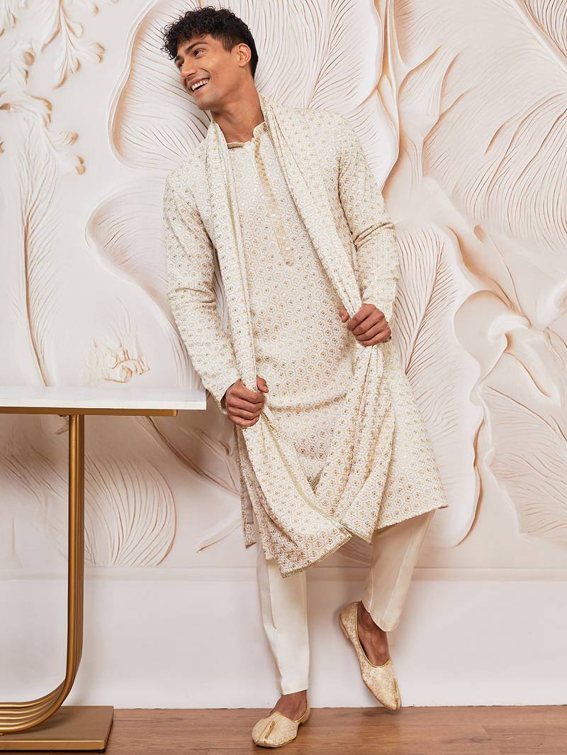 Off White Chikankari Embroidered Kurta Set With Cream Satin Pyjama & Embroidered Dupatta | Eid Wedding Wear