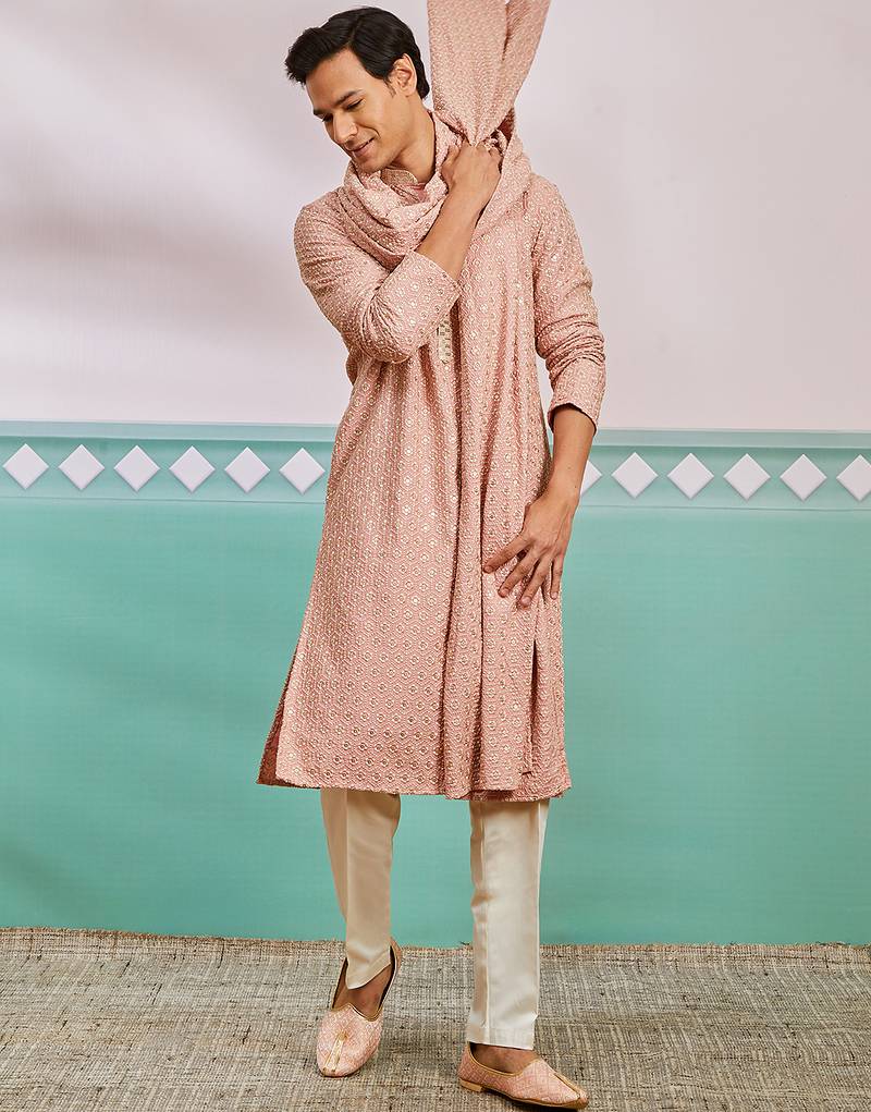 Peach Chikankari Rayon Kurta With Cream Pyjama & Peach Embroidered Dupatta | Distinctive Festive Ensemble