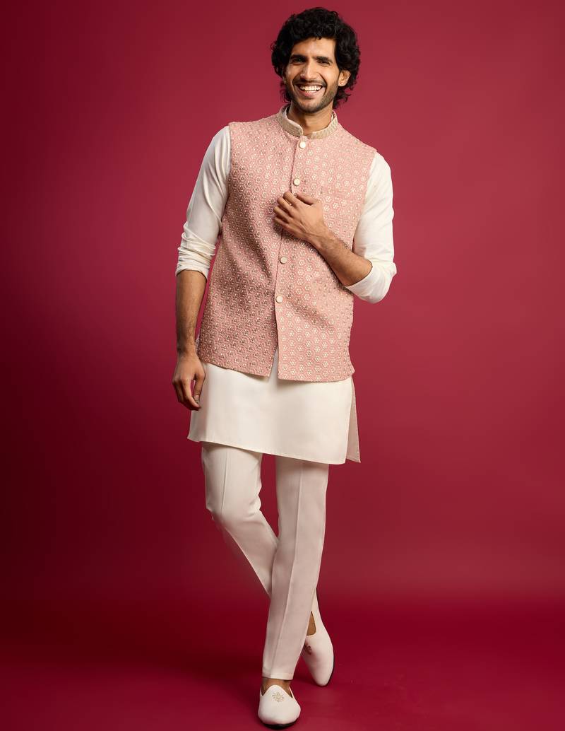 Peach Sequin & Thread Embroidered Nehru Jacket With Cream Satin Kurta & Pants Set | Festive Ethnic Bundle |