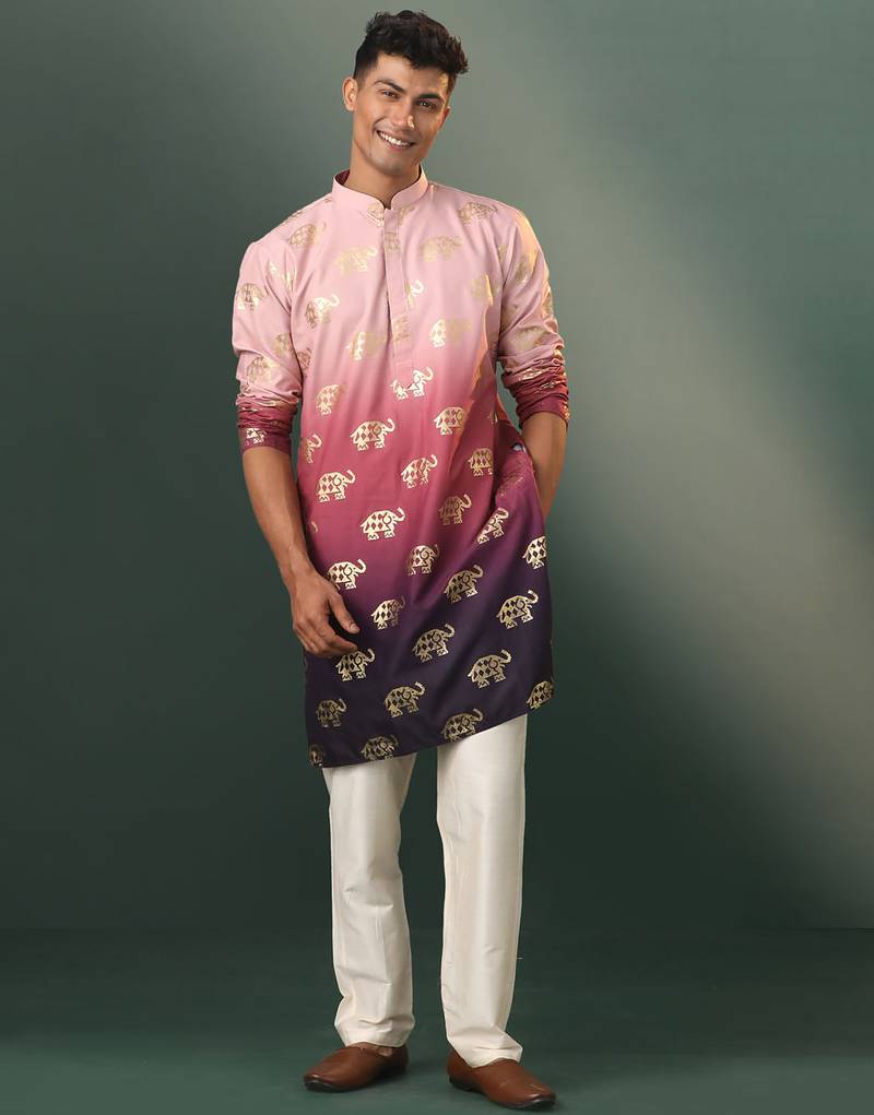 Pink Silk Blend Foil Elephant Print Kurta With Cream Pyjama Set | Festive Ombre