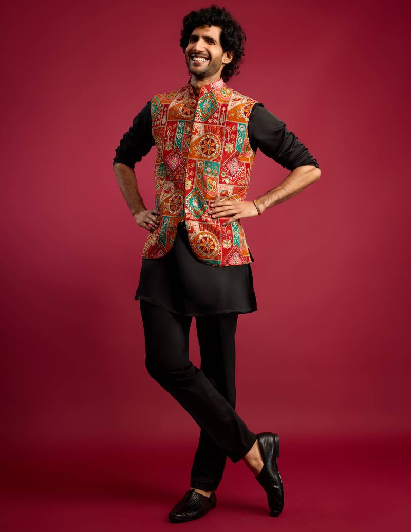 Red Embroidered Nehru Jacket With Black Kurta & Pant Set
