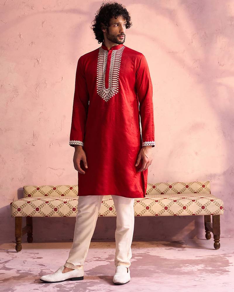 Red Thread Embroidered Cotton Kurta With Cream Fine Satin Pyjama | Festive Ethnic Set
