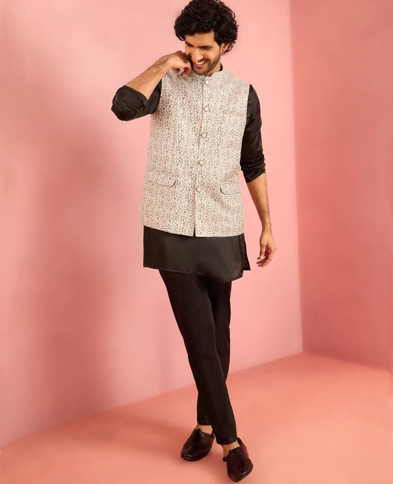 Silver Geometric Jacquard Nehru Jacket With Black Kurta Pyjama Set | Wedding Party Wear