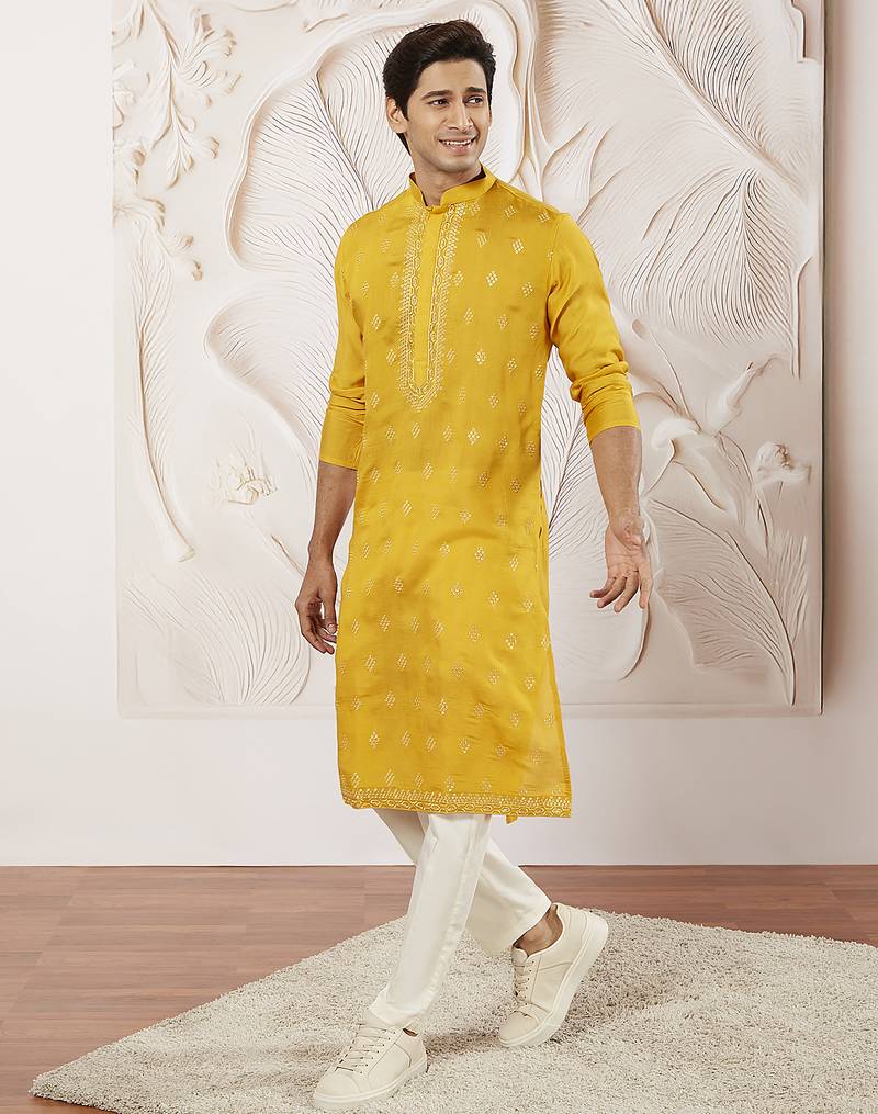 Refresh your festive collection with this vibrant ethnic bundle from Vastramay. The set includes a beautifully crafted yellow Fendi silk kurta featuring all-over thread embroidery in traditional ethnic motifs across the yoke and entire body. The knee-length kurta is tailored in a straight silhouette with full sleeves, concealed button closure, and side slits for comfort. Paired with a cream fine satin pyjama that offers supreme comfort with its elasticated drawstring waistband and 2 inseam pockets for practicality. The elaborate embroidery work combined with the rich yellow hue creates a striking festive ensemble. Ideal for weddings, Diwali, Durga Puja, and festive glitz celebrations, this kurta pyjama set combines traditional artistry with contemporary appeal. Care Instructions: Dry clean recommended to preserve the intricate embroidery and silk fabric.