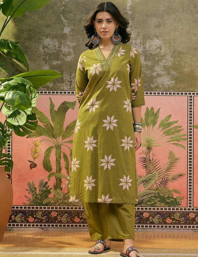 If you find the product for less we'll match it! Know MoreGreen Floral Print Straight Kurta With Trousers & Dupatta, Straight Calf Length Kurta & Straight Hem, Has A V Neck, Three-Quarter Regular Slevees, Solid Trousers Elasticated Waistband, Slip-On Closure, Has A Pocket, Printed Dupatta, Has A Taping Border.