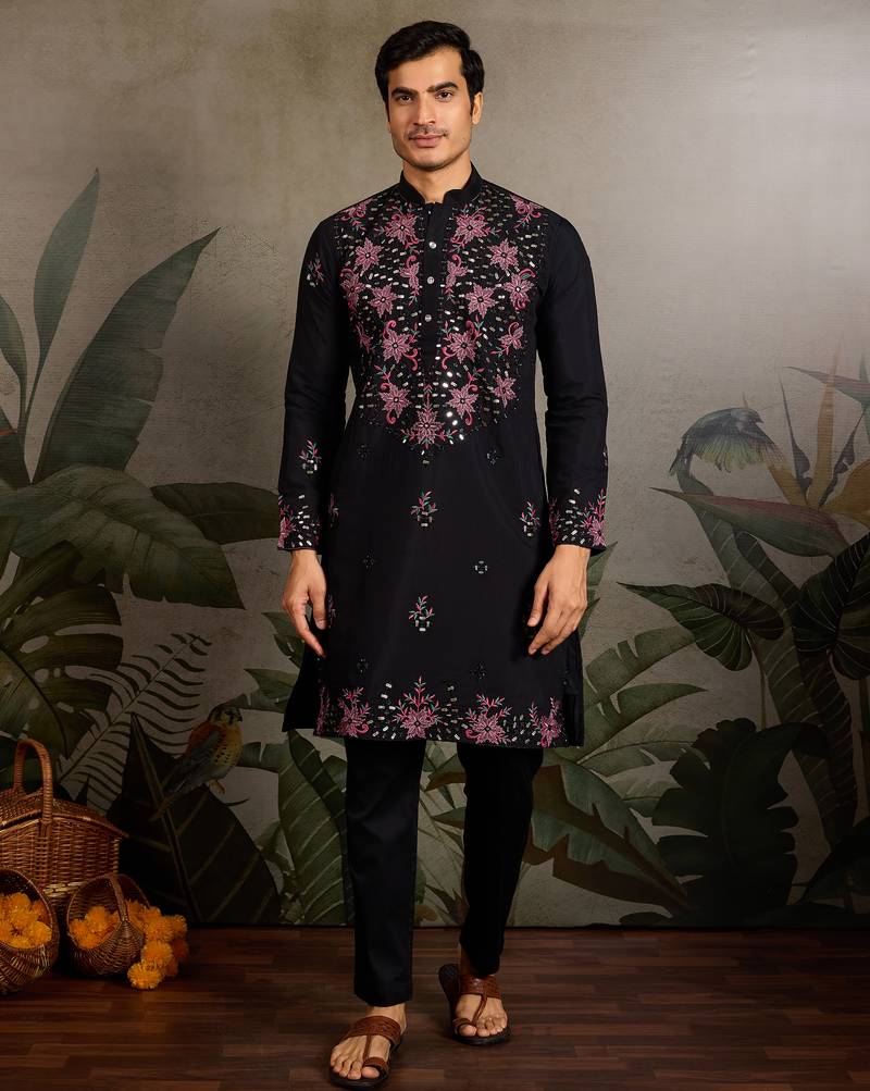 Black Viscose Silk Real Mirror With Thread & Sequence Embroidered Work Kurta Only
