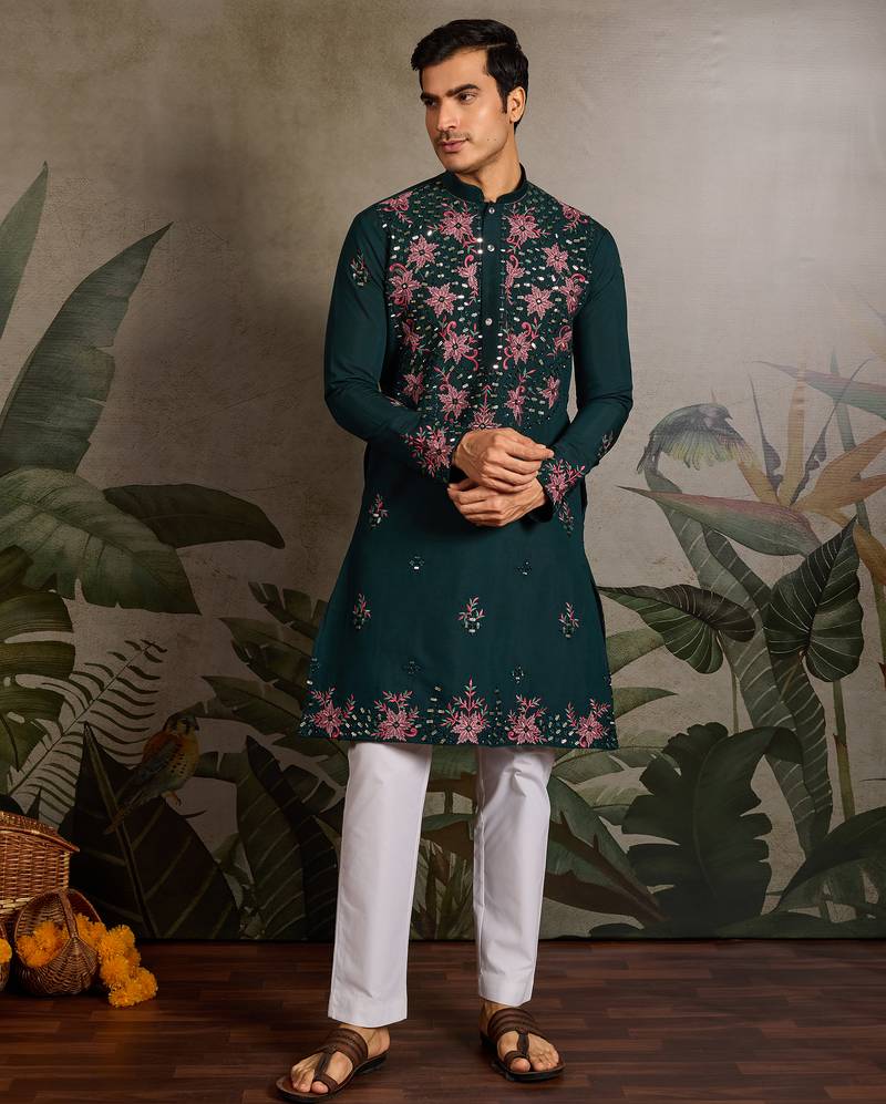 • Product Id : 4694426 • Package Details : 1 Kurta • Type : Kurta • Occasion : Wedding • Fabric : Viscose • Work : Embroidered • Type : Mirror Work • Look : Designer • Sleeve : Full Sleeve • Neck Style : Band Collar Neck Kameez • Color : Green • Top Color : Green • Top Fabric : Silk,Viscose • Stitching : Stitched Payments [+]